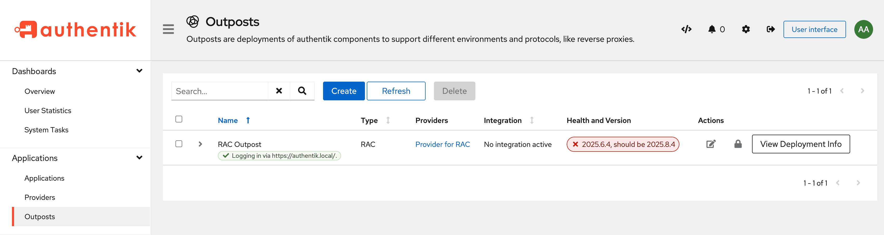 To check if any outposts are out-of-date, navigate to Applications > Outposts and look for a message in the Health and Version column.